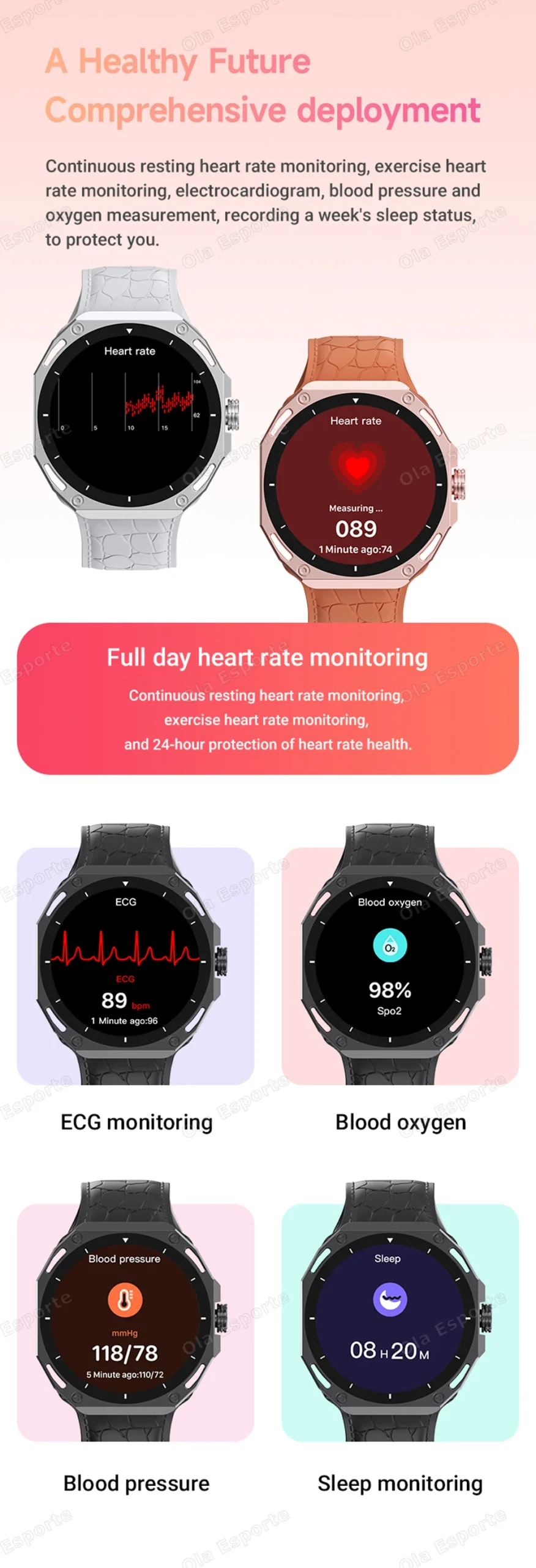 La montre assure le suivi de l’activité physique, du sommeil, de la fréquence cardiaque, de la pression artérielle et de l’oxygène sanguin (SpO₂) afin de mieux comprendre vos habitudes et votre bien-être au quotidien.