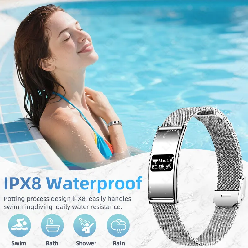 Bracelet intelligent extra-fin (2,8 mm) au style moderne et discret, conçu pour être porté toute la journée. Son bracelet en acier fin et son design minimaliste conviennent aussi bien à un usage quotidien qu’élégant.