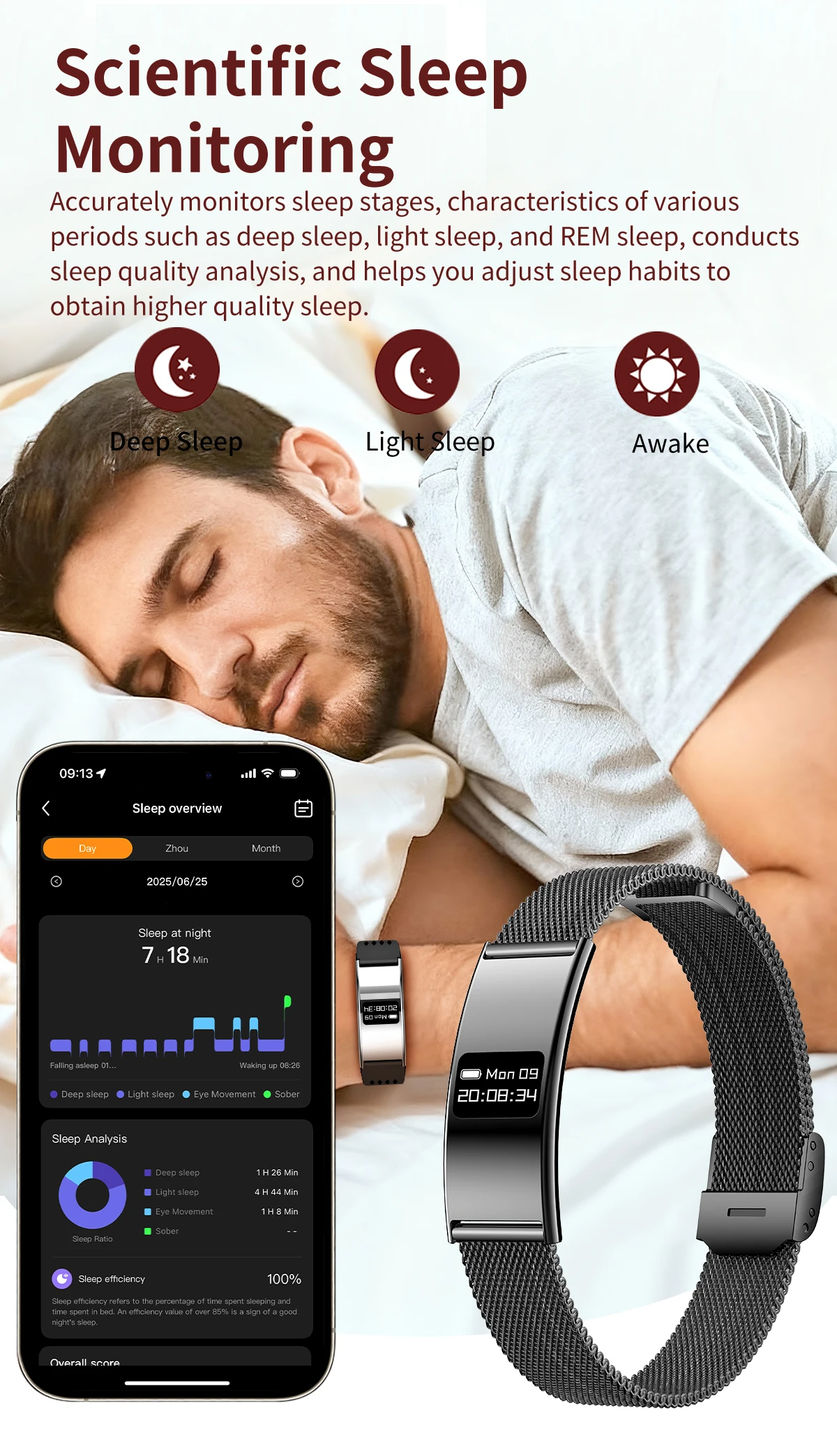 Bracelet intelligent extra-fin (2,8 mm) au style moderne et discret, conçu pour être porté toute la journée. Son bracelet en acier fin et son design minimaliste conviennent aussi bien à un usage quotidien qu’élégant.