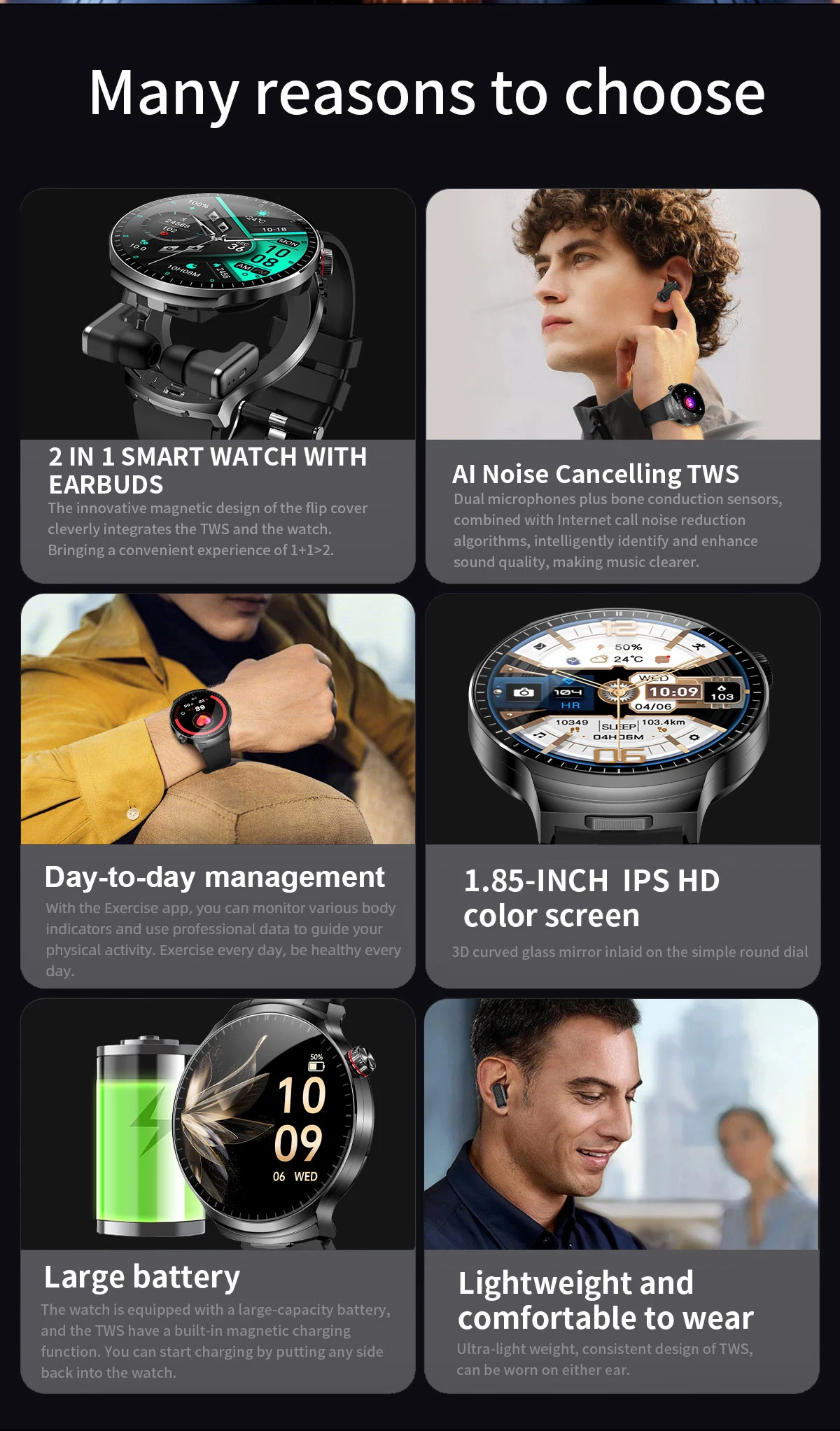 Cette montre connectée unisexe 2-en-1 combine montre intelligente et écouteurs sans fil intégrés, offrant une solution pratique pour le sport, le travail et la vie quotidienne. Les écouteurs TWS se rangent directement dans le boîtier de la montre et se rechargent automatiquement, permettant d’écouter de la musique ou de prendre des appels sans accessoire supplémentaire.