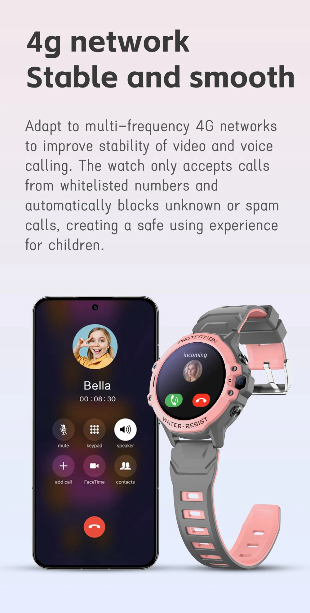 Aucun Bluetooth n’est requis : la montre fonctionne de manière indépendante via le réseau 4G, simplifiant la configuration et l’utilisation.