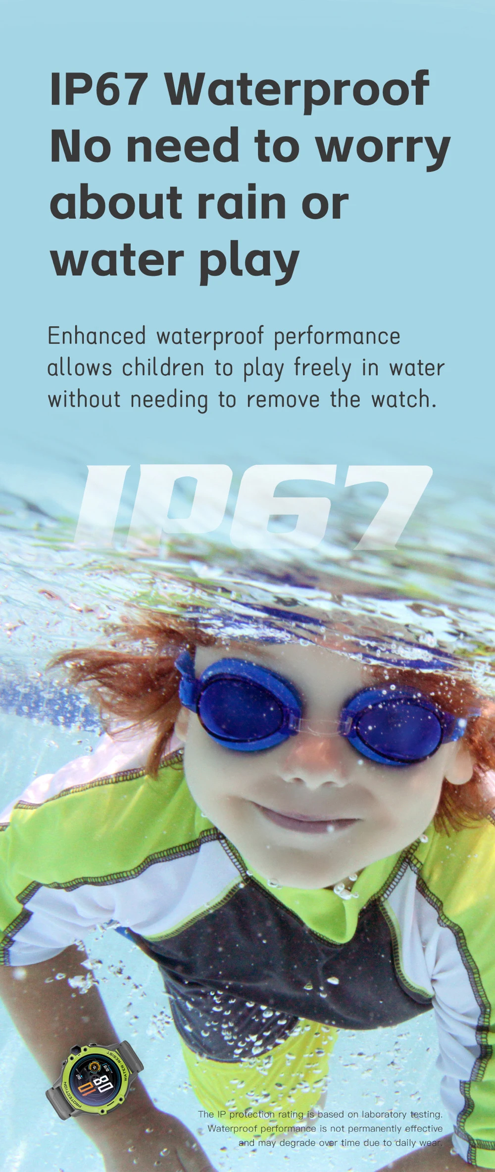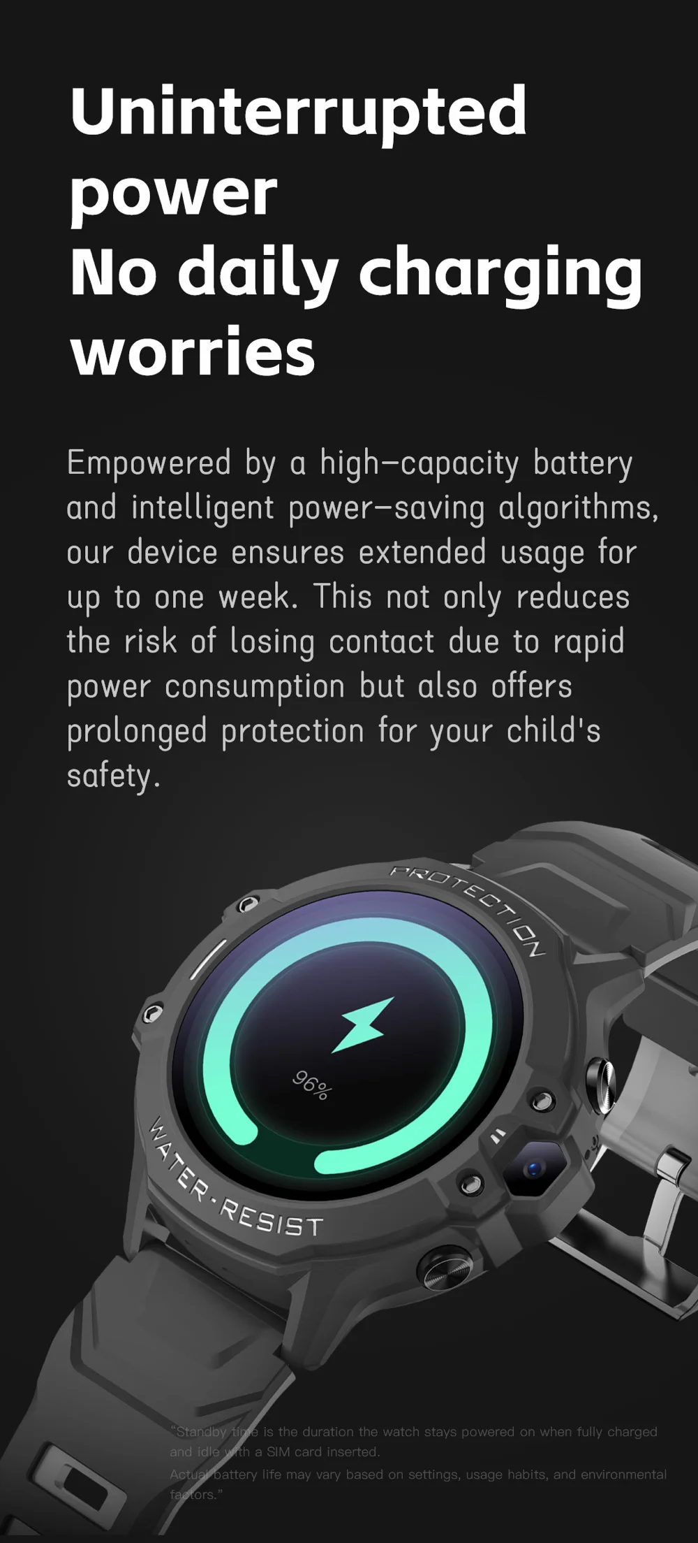 Dotée d’un écran de 1,28 pouce, d’un bracelet en gel détachable et d’un boîtier en alliage, cette montre est conçue pour résister aux activités quotidiennes des enfants. Elle est résistante à l’eau pour un usage quotidien (éclaboussures, pluie légère).
