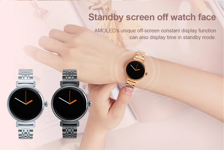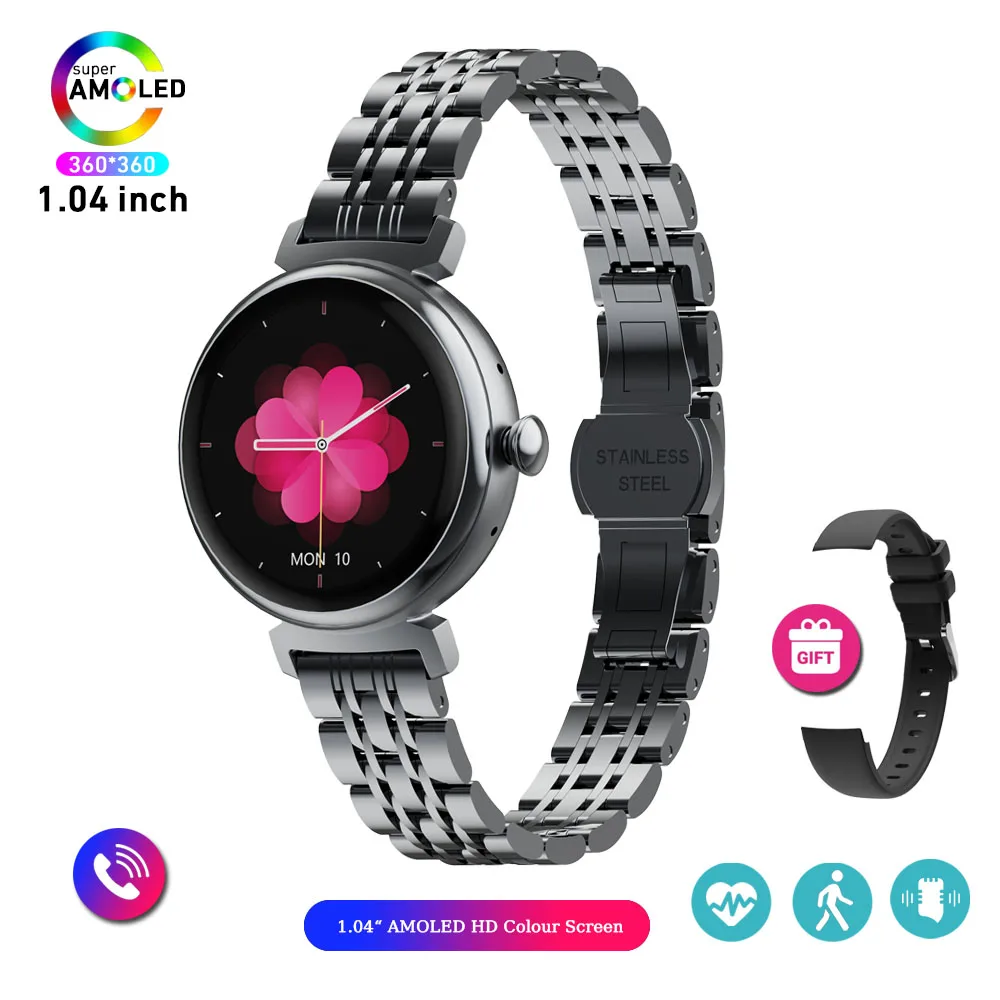 Cette montre connectée femme au format compact est idéale pour celles qui recherchent un design raffiné avec un petit cadran élégant. Dotée d’un écran AMOLED 1.04 pouces haute définition (454×454), elle offre une excellente netteté malgré son format discret.