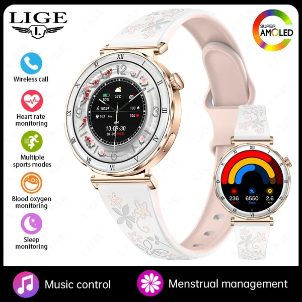 Montre Connectée Femme AMOLED 1.19” – Appel Bluetooth, Suivi Santé Féminin, Sport & Cadrans Personnalisables – ROSE / BLANC