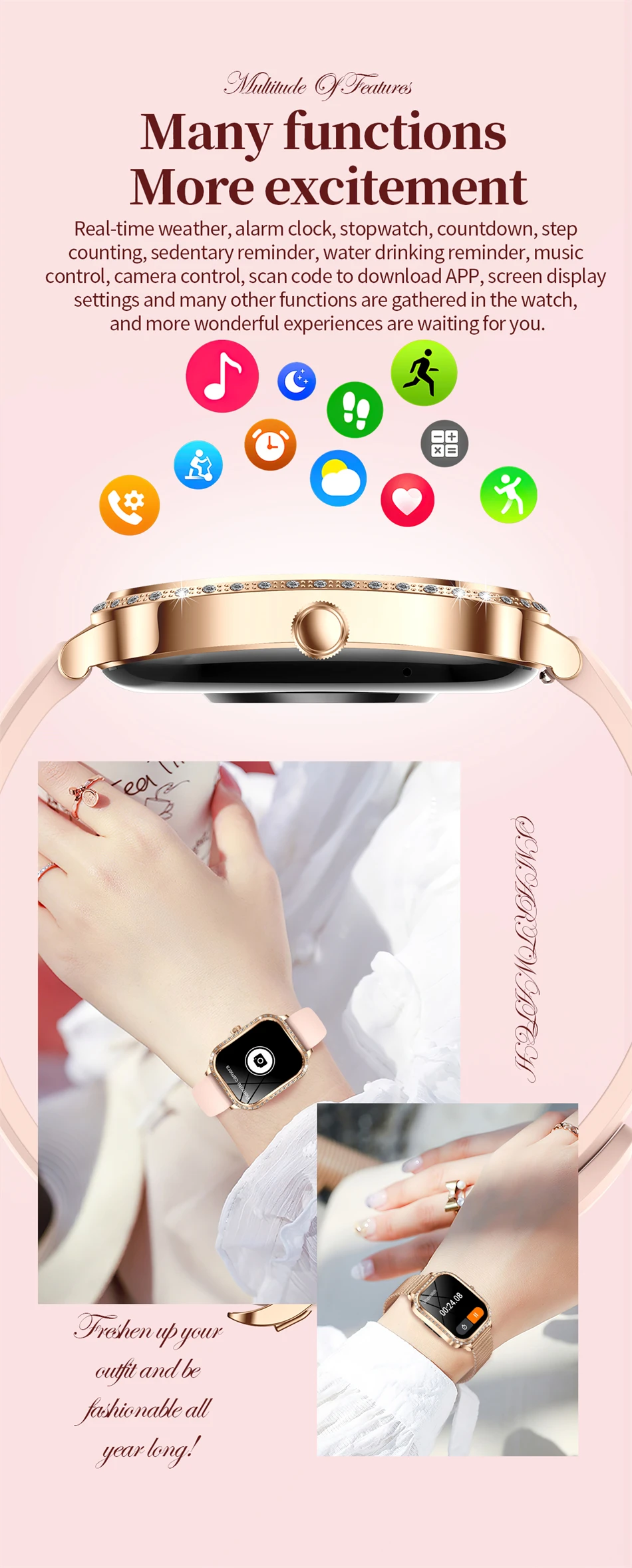 Montre Connectée Femme Luxe 1.75” HD – Appel Bluetooth, Suivi Santé, IP68, Sport & Fitness – CUIR ROSE + 1 BRACELET