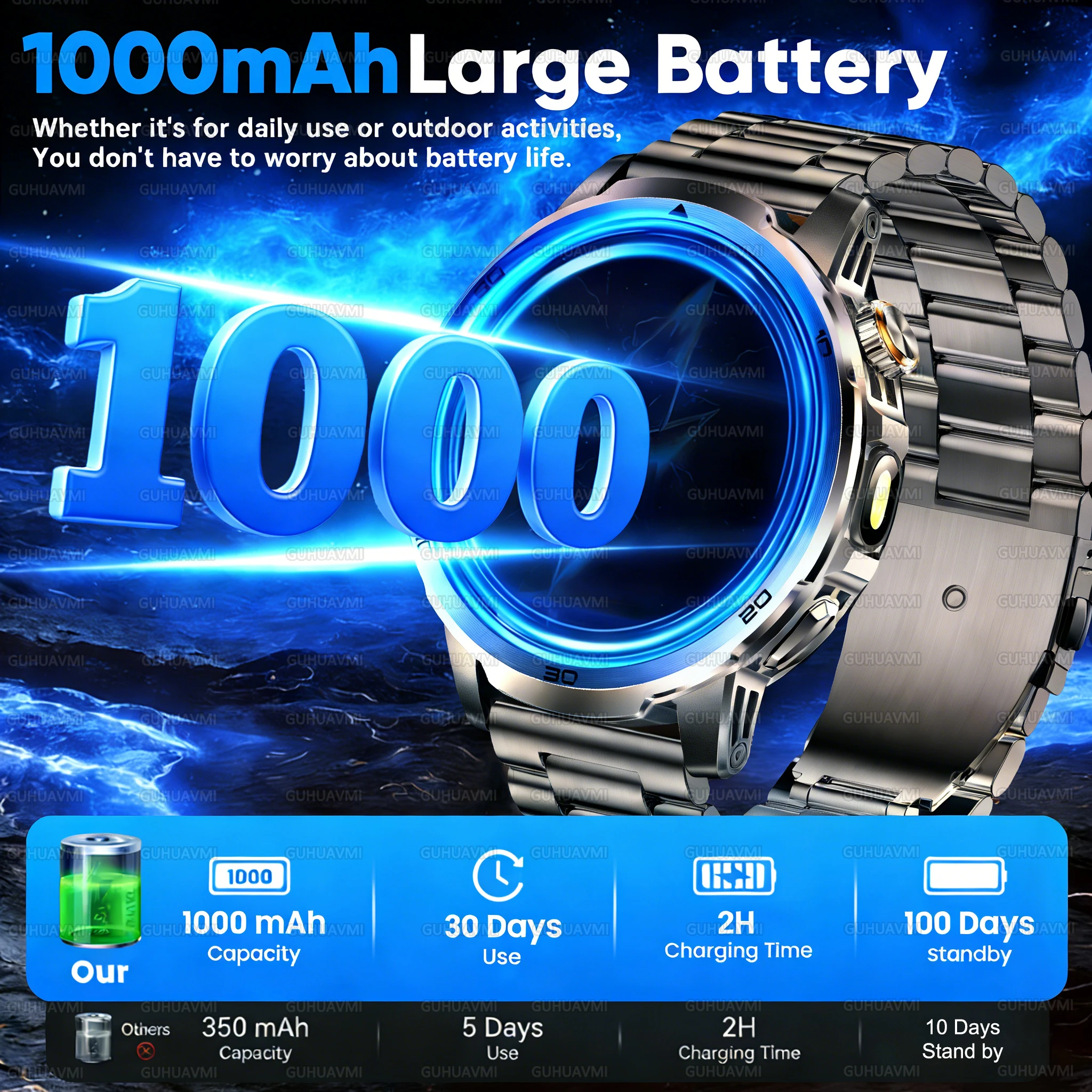 La montre connectée homme 2026 GUHUAVMI est conçue pour les sportifs et les hommes actifs recherchant performance, résistance et autonomie exceptionnelle. Équipée d’un écran AMOLED 1.85 pouces HD, d’une batterie haute capacité 1000mAh et d’une étanchéité professionnelle 10ATM + IP69K, elle est idéale pour le sport intensif, la natation et les activités extérieures.