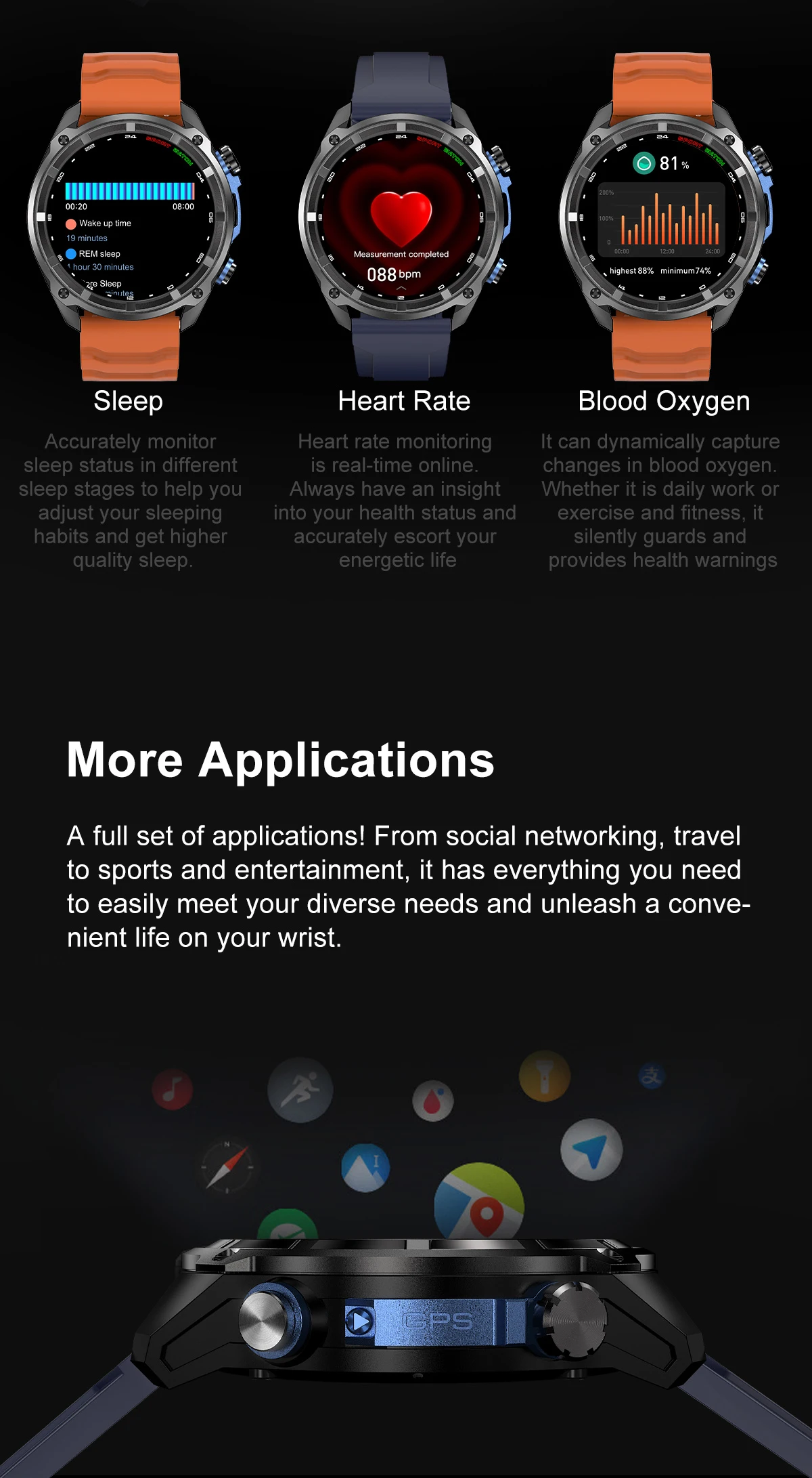 Montre Connectée Homme GPS Militaire – Cartographie Hors Ligne, 4GB Mémoire, Batterie 1000mAh, 10ATM Étanche, Appel Bluetooth - NOIR