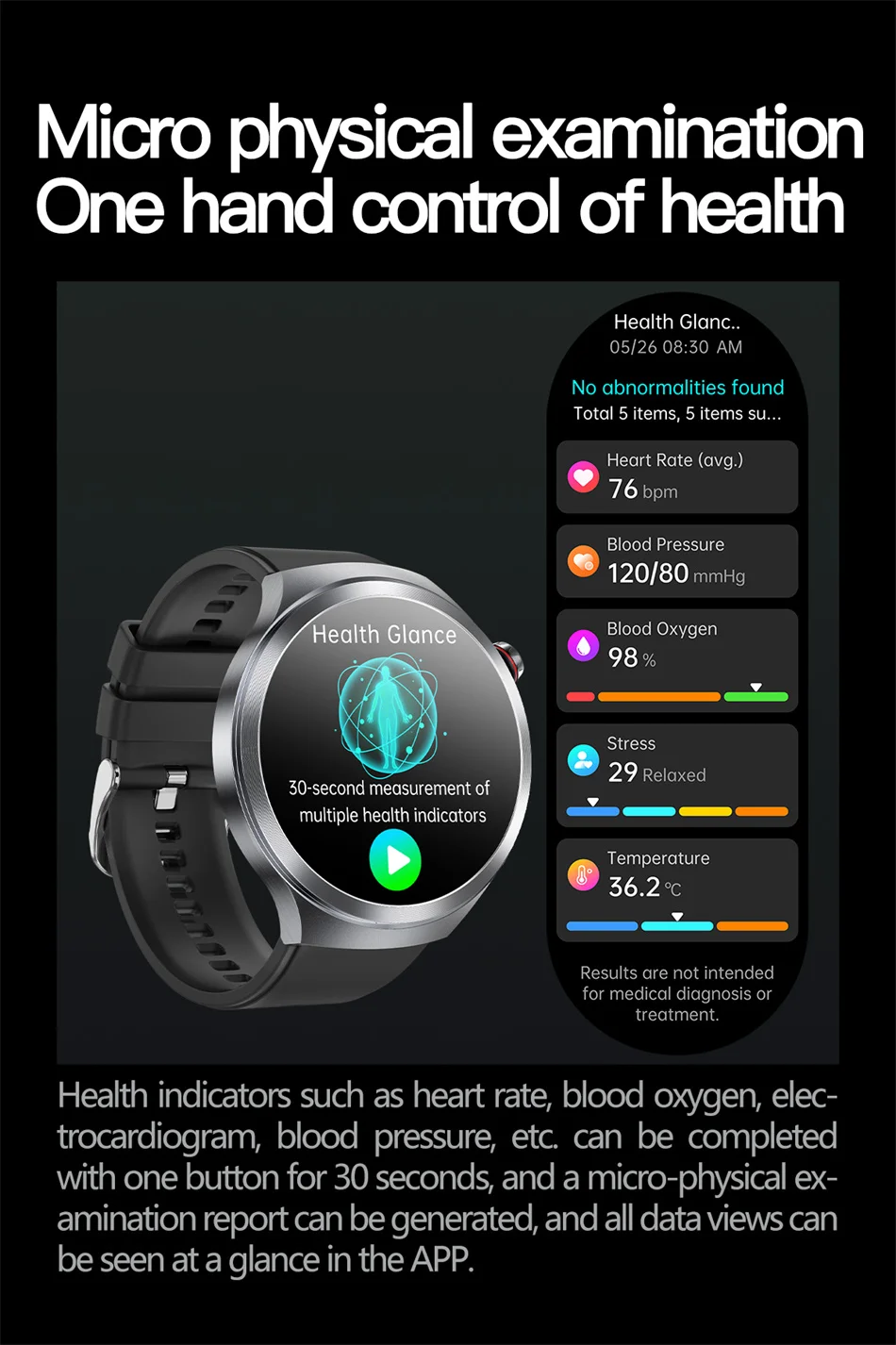 Dotée de capteurs avancés (ECG + PPG, température, oxygène sanguin, pression artérielle, acide urique), cette montre agit comme un outil de gestion santé intelligent, tout en conservant les fonctions essentielles d’une montre connectée moderne (appels Bluetooth, notifications, suivi d’activité).