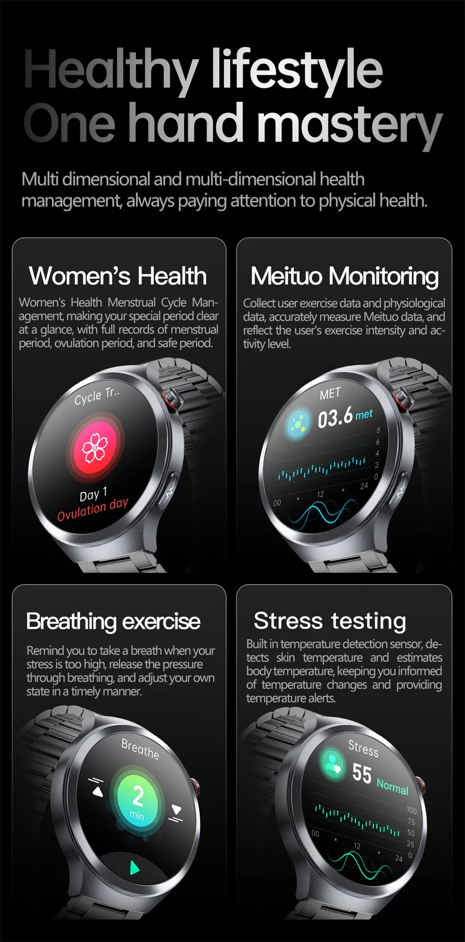 Dotée de capteurs avancés (ECG + PPG, température, oxygène sanguin, pression artérielle, acide urique), cette montre agit comme un outil de gestion santé intelligent, tout en conservant les fonctions essentielles d’une montre connectée moderne (appels Bluetooth, notifications, suivi d’activité).
