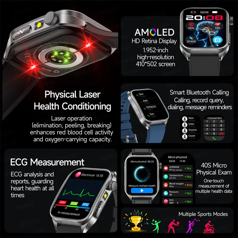 Montre connectée santé avec ECG, suivi sanguin et thérapie laser | Bien-être avancé – MESH NOIR + 2 BRACELETS