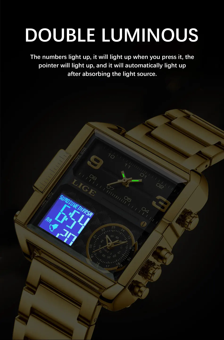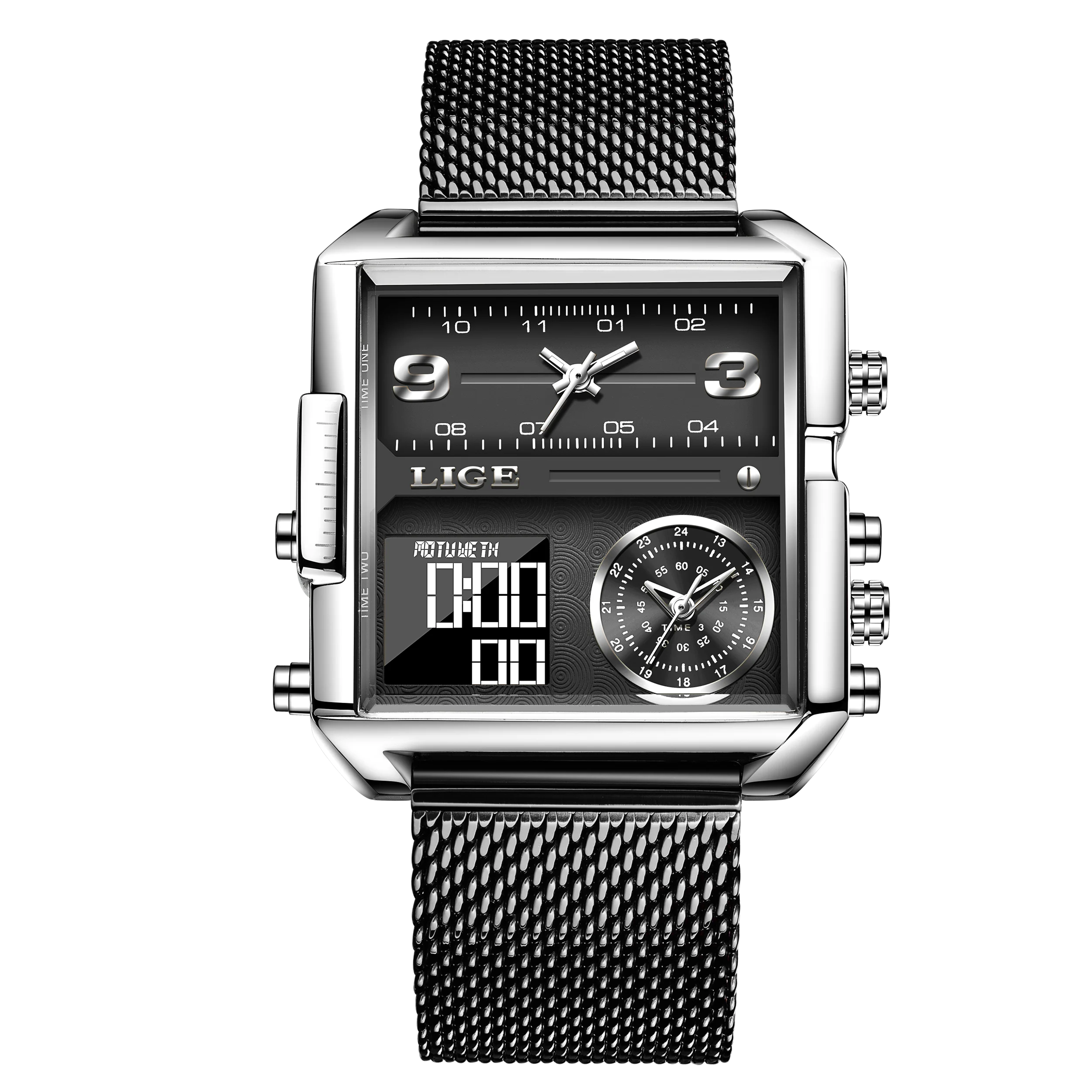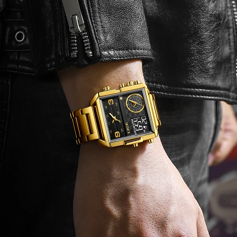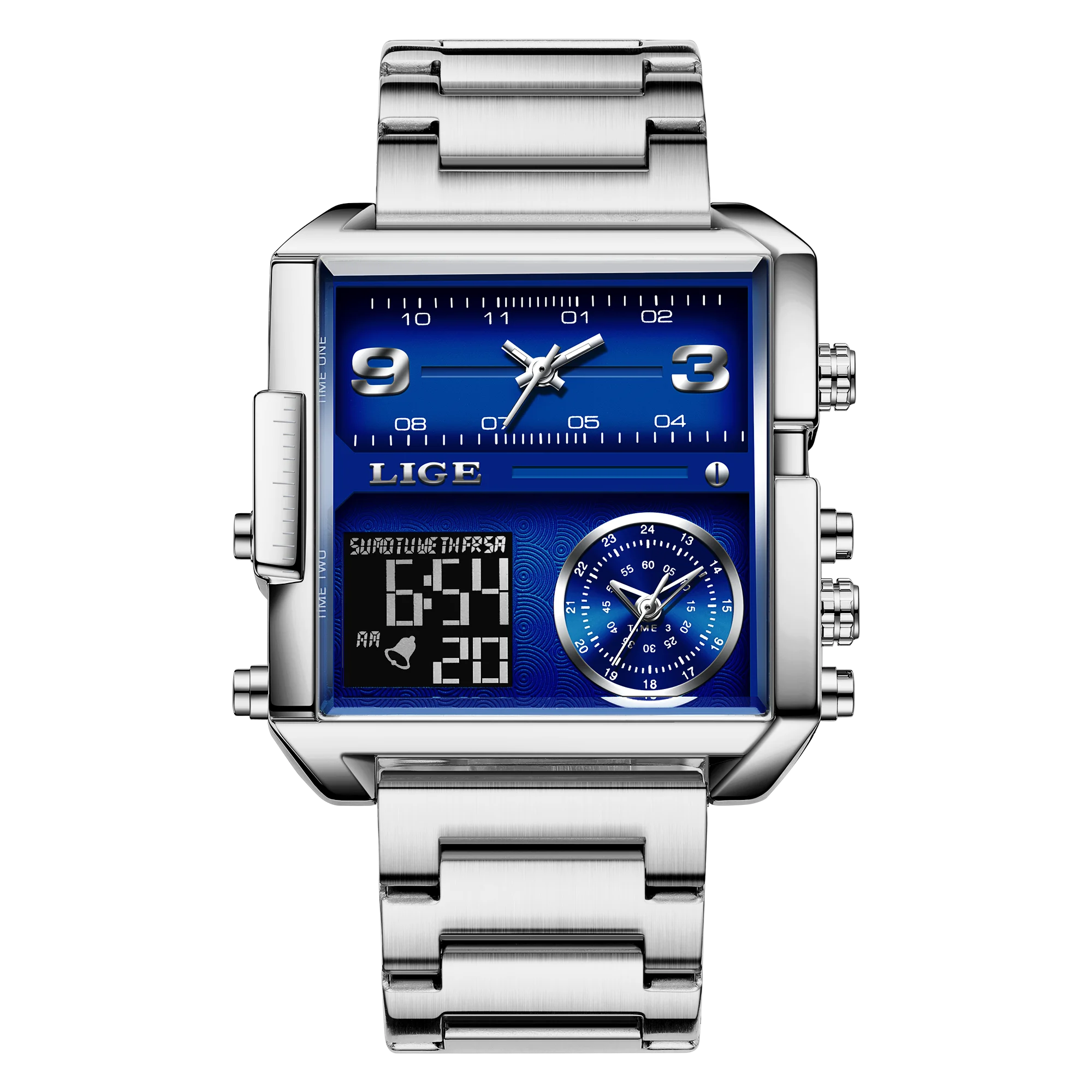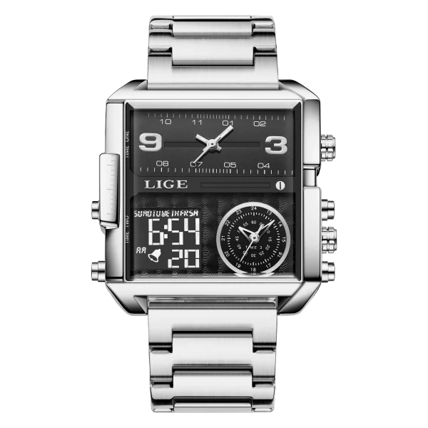 Cette montre homme combine un design carré moderne avec des fonctionnalités pratiques pour le quotidien. Son double affichage analogique et digital permet une lecture claire de l’heure tout en intégrant plusieurs fonctions utiles comme le chronomètre, l’alarme et le calendrier.