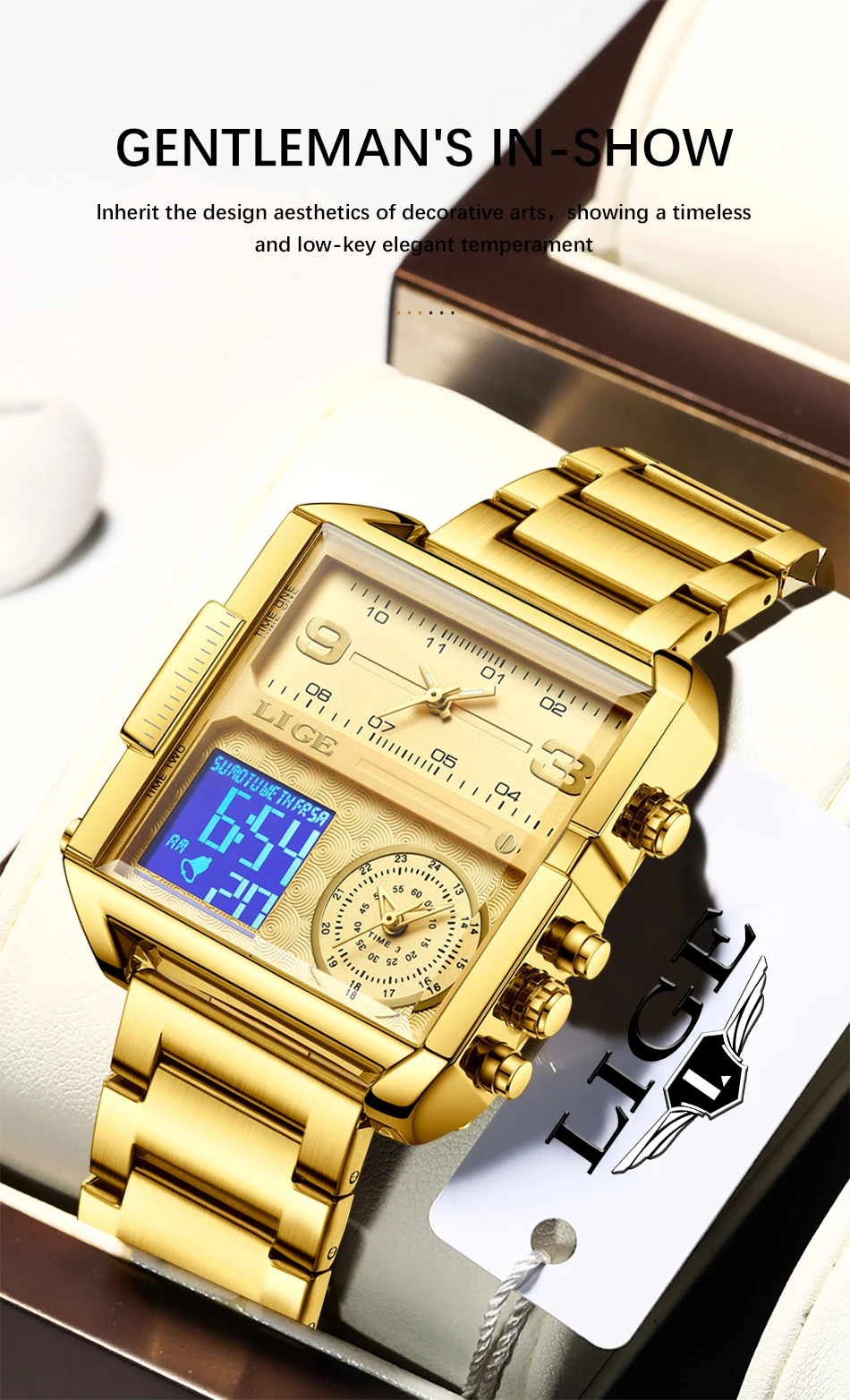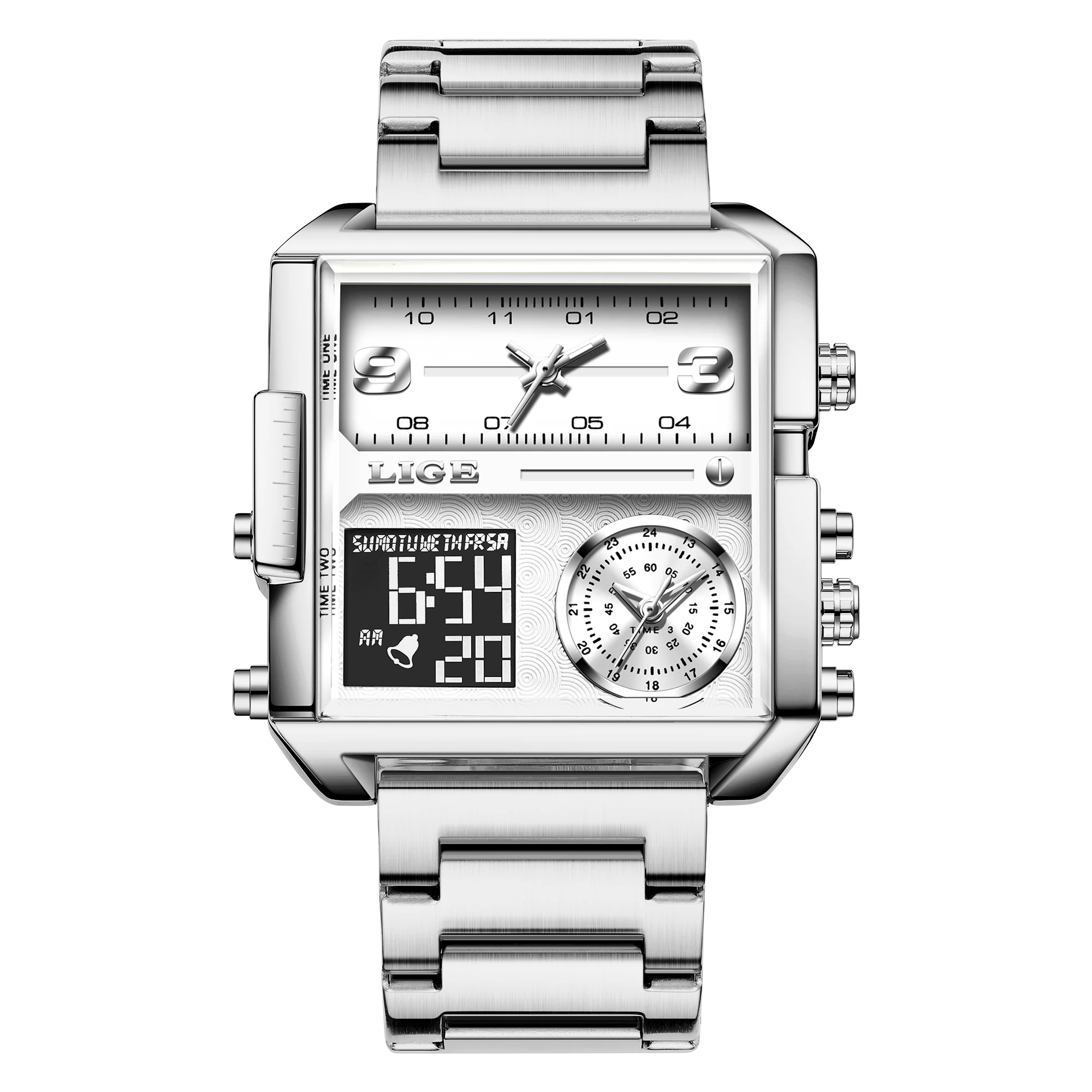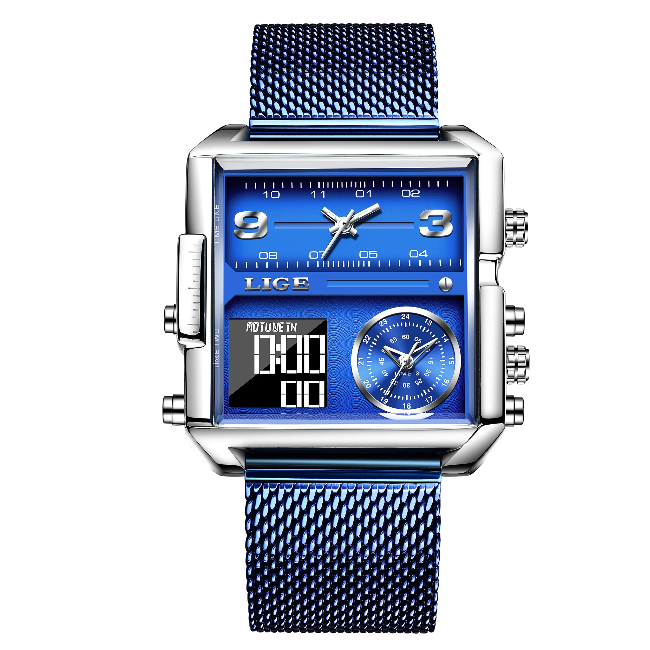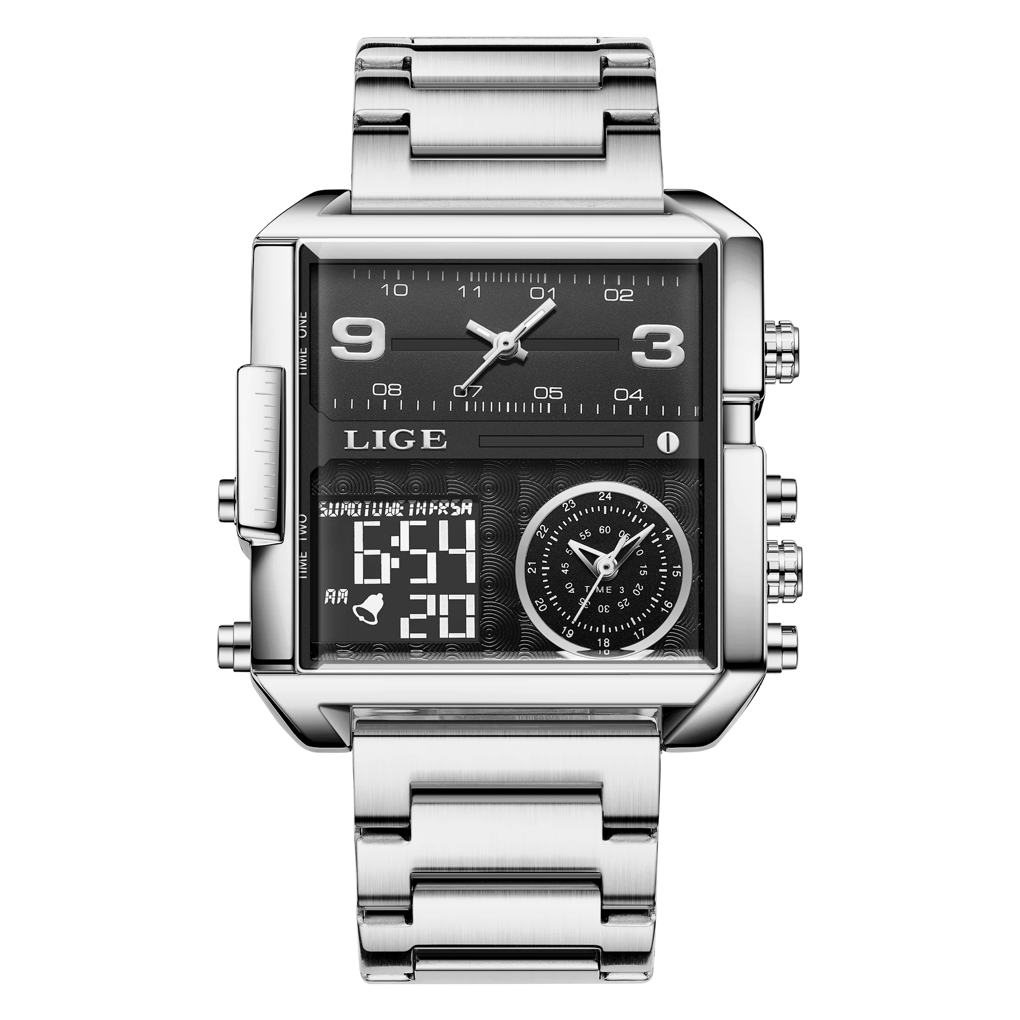 Cette montre homme combine un design carré moderne avec des fonctionnalités pratiques pour le quotidien. Son double affichage analogique et digital permet une lecture claire de l’heure tout en intégrant plusieurs fonctions utiles comme le chronomètre, l’alarme et le calendrier.