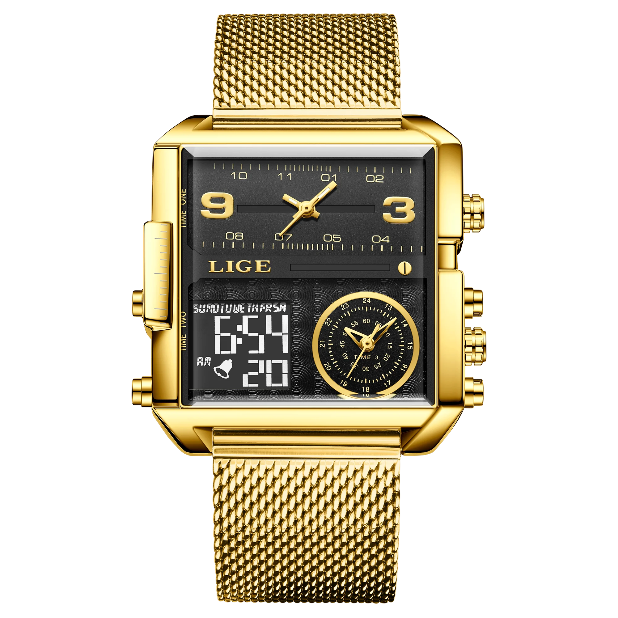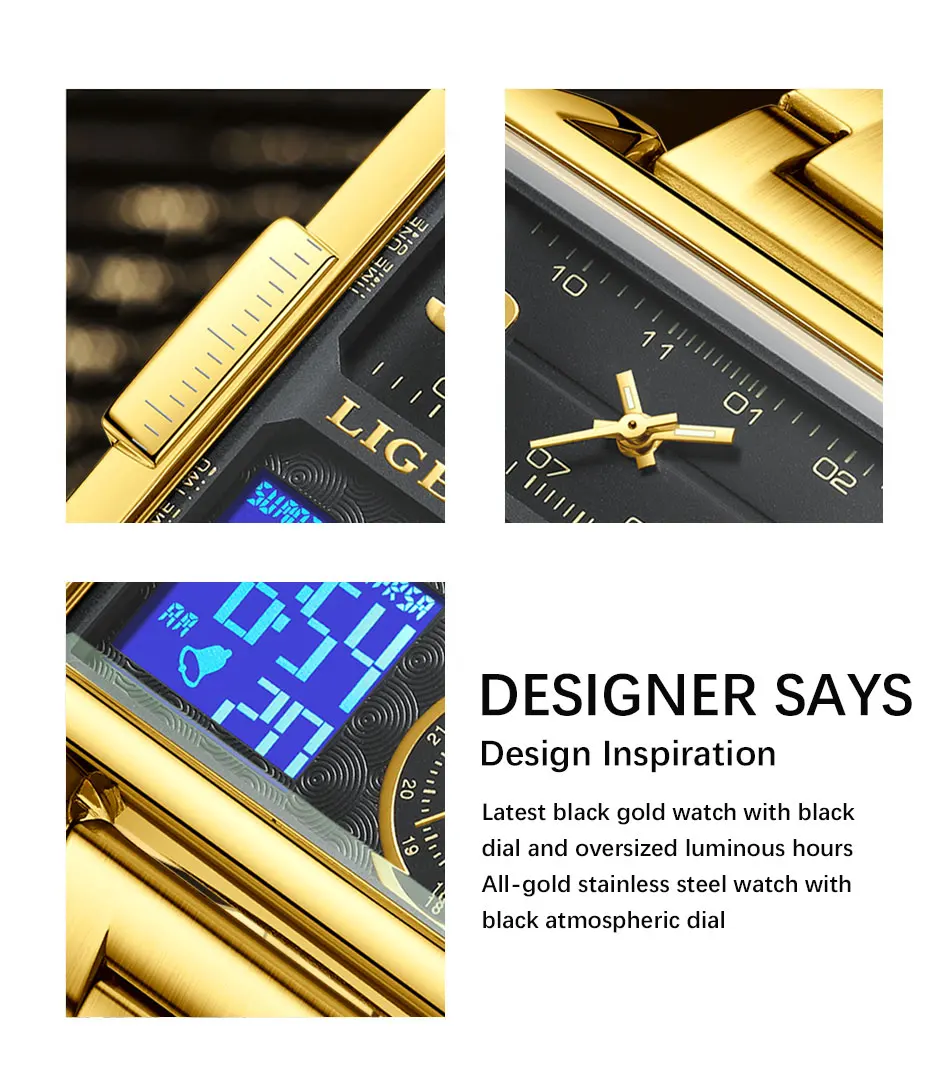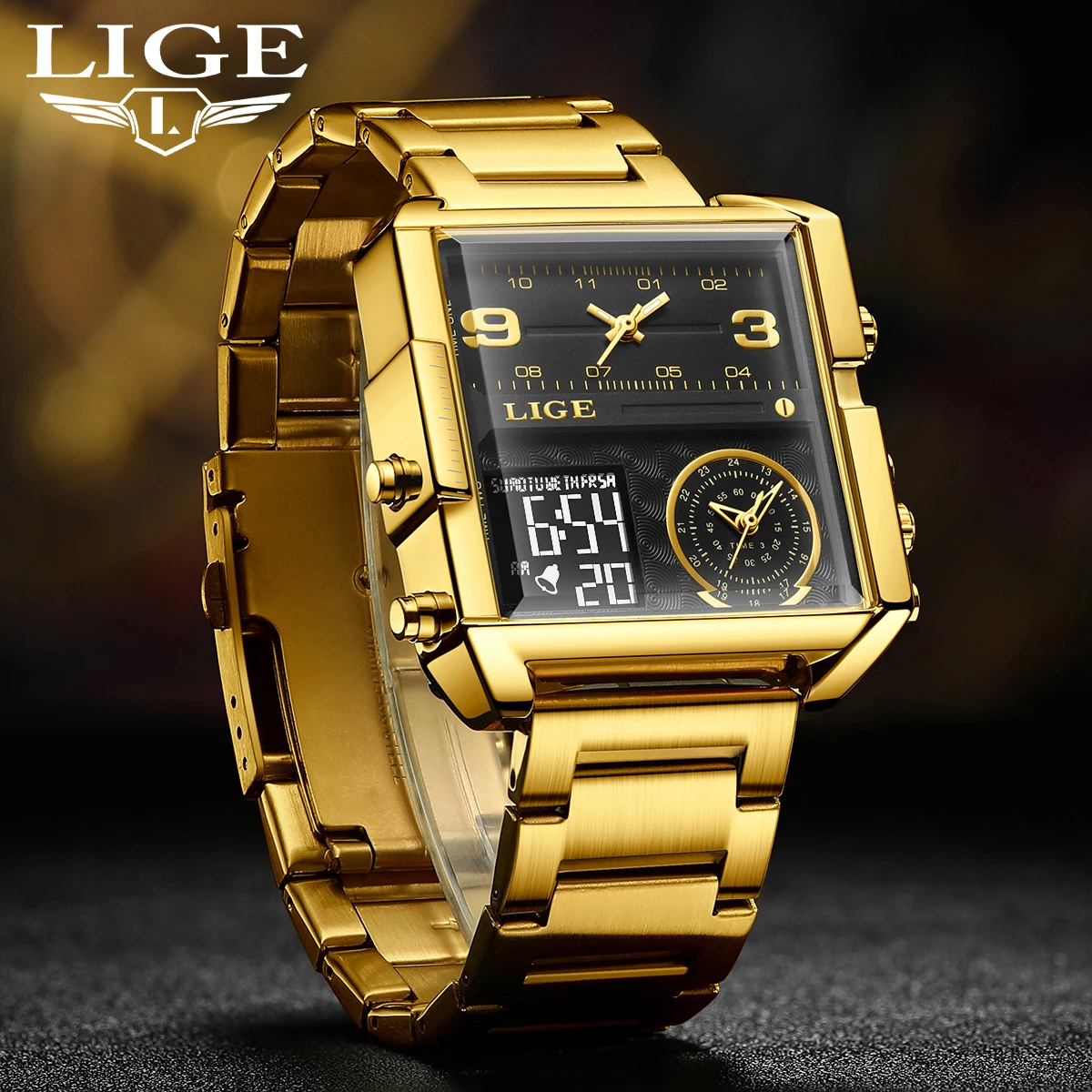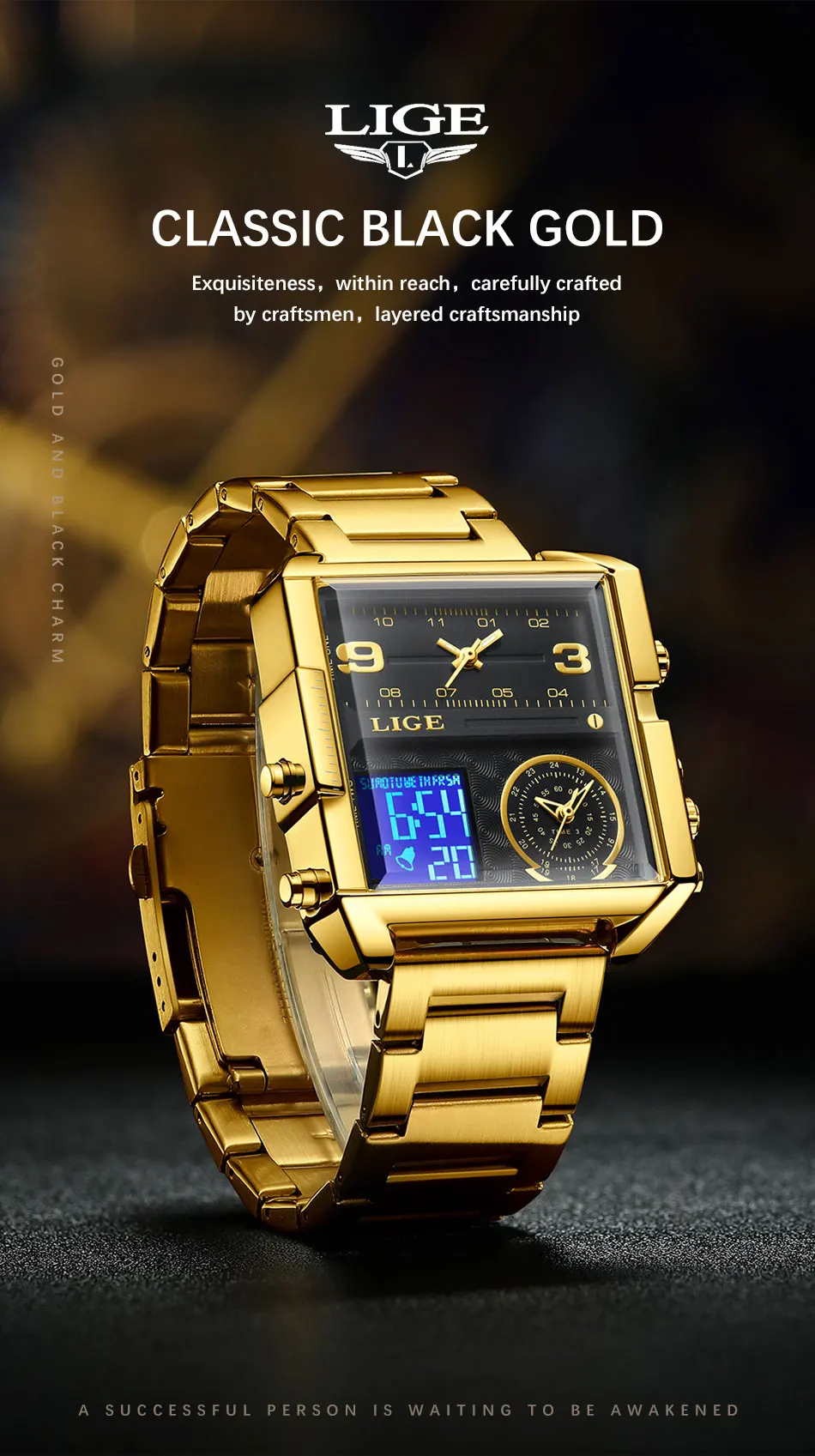 Cette montre homme combine un design carré moderne avec des fonctionnalités pratiques pour le quotidien. Son double affichage analogique et digital permet une lecture claire de l’heure tout en intégrant plusieurs fonctions utiles comme le chronomètre, l’alarme et le calendrier.