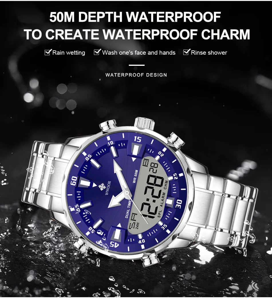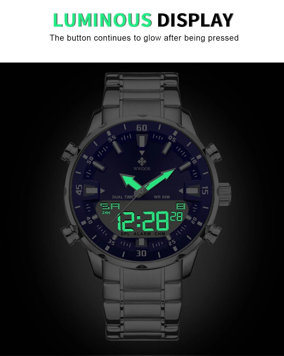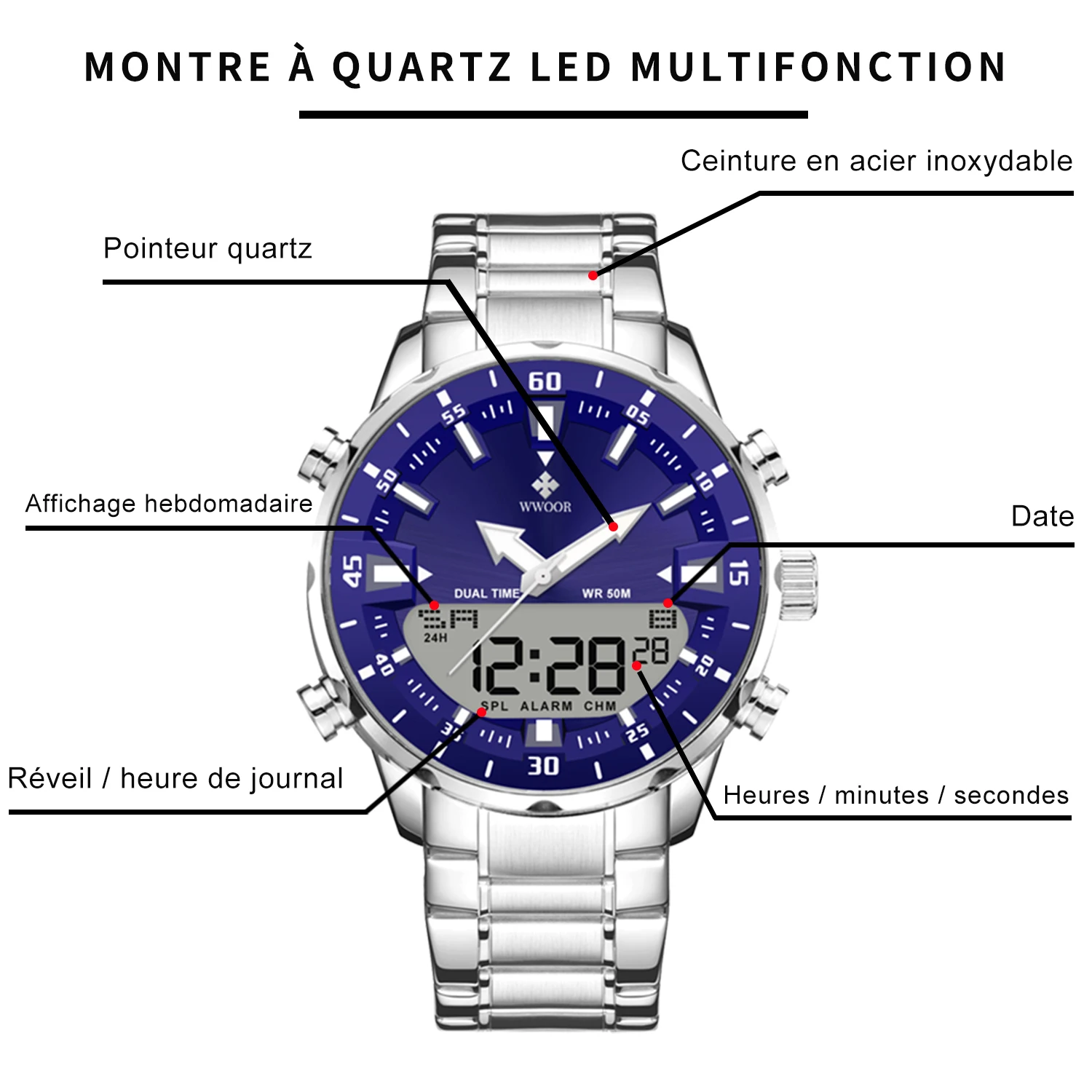 Cette montre homme combine un design sportif et élégant avec des fonctionnalités modernes. Son double affichage analogique et digital permet une lecture complète de l’heure tout en intégrant plusieurs fonctions utiles pour le quotidien.