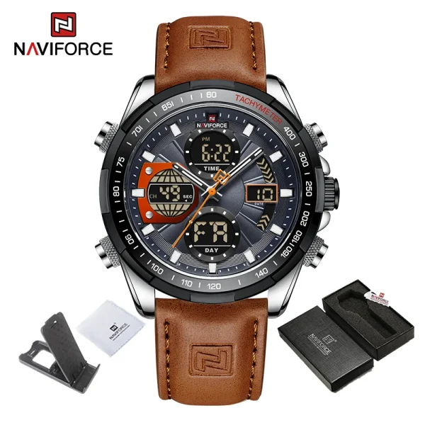 Montre Homme Analogique Digitale Multifonction – Bracelet Cuir Véritable – MARRON / ARGENT
