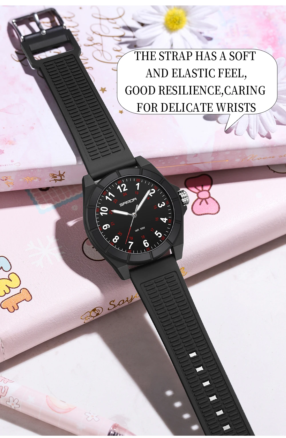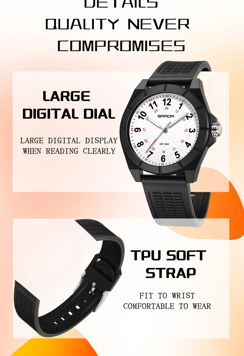 Cette montre sport quartz est conçue pour les enfants et adolescents actifs qui recherchent une montre fiable, confortable et facile à lire. Son design simple et moderne s’adapte parfaitement à une utilisation quotidienne, à l’école ou pendant les activités sportives.